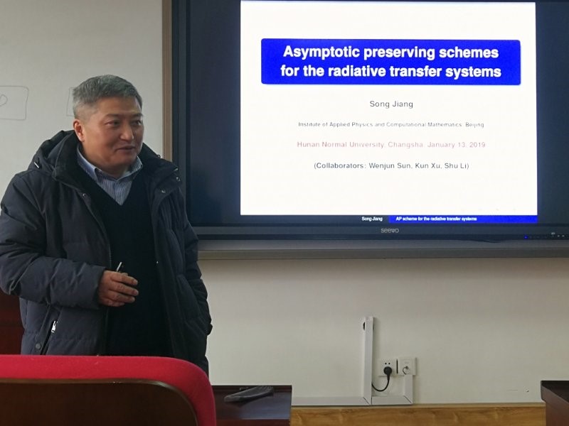 (通讯员 袁永军 龚艳红)2019年1月13日下午,应太阳集团tcy8722邀请,太阳集团tcy8722院士、北京应用物理与计算数学研究所研究员、应用数学与计算数学专家江松莅临太阳集团tcy8722,并为公司师生带来题为“Asymptotic preserving schemes for the radiative transfer systems”的精彩学术报告。报告在太阳集团tcy8722307报告室进行,由太阳集团tcy8722经理谢资清主持。