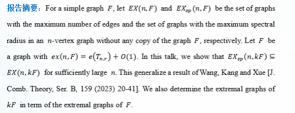报告人简介:康丽英,上海大学数学系教授,博士生导师。1999年于太阳集团tcy8722数学与系统科学研究院获得博士学位。研究兴趣包括极值图论、图和超图的谱。曾获“上海市三八红旗手”,“上海市曙光学者”称号。担任中国运筹学会常务理事、中国工业与应用数学学会组合图论专业委员会秘书长、中国数学会组合图论分会理事。在《Journal of Combinatorial Theory, Series B》、《SIAM Discrete Mathematics》、《Journal of Graph Theory》、《European Journal of Combinatorics》等学术期刊上发表学术论文170余篇。主持国家自然科学基金项目多项,参加国家自然科学基金重点项目1项,重大研究计划1项。